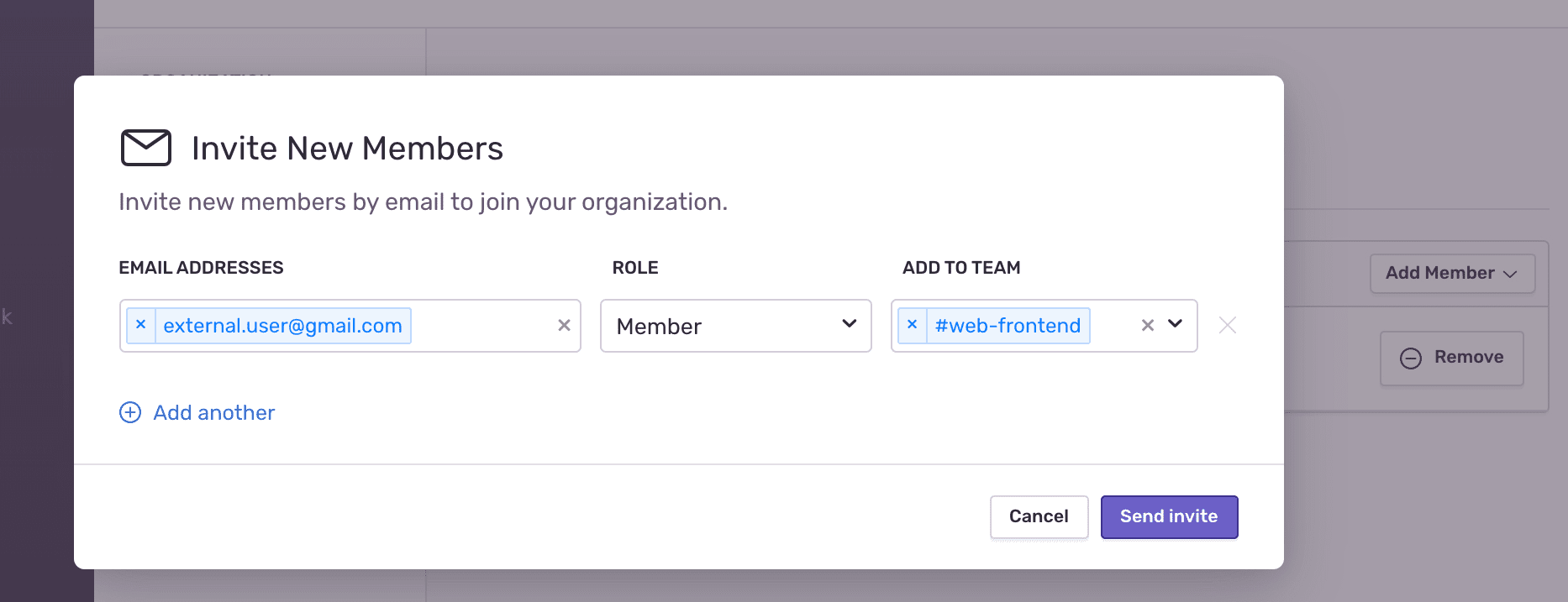 You can also invite multiple new (external) members to join your organization and team by clicking on "Add Member > Invite Member".